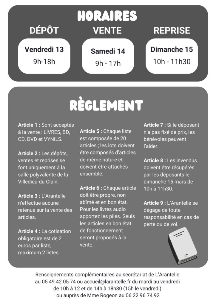 BOURSE AUX LIVRES 13, 14 et 15 mars 2026 En savoir plus Les dernières actus Inscriptions à L’Accueil de Loisirs janvier 6, 2026 Lire la suite Déménagement avant travaux novembre 27, 2025 Lire la suite Cie Crac Boum Hue « Le Lavoir » et « Jeu de Planches » novembre 14, 2025 Lire la suite Bourse au jouets, jeux & articles de puériculture octobre 30, 2025 Lire la suite Toutes les actus